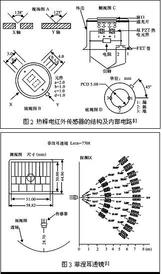 熱釋電傳感器利用的正是熱釋電效應(yīng),是一種溫度敏感傳感器。它由陶瓷氧化物或壓電晶體元件組成,元件兩個表面做成電極,當傳感器監(jiān)測范圍內(nèi)溫度有ΔT的變化時,熱釋電效應(yīng)會在兩個電極上會產(chǎn)生電荷ΔQ,即在兩電極之間產(chǎn)生一微弱電壓ΔV。由于它的輸出阻抗極高,所以傳感器中有一個場效應(yīng)管進行阻抗變換。熱釋電效應(yīng)所產(chǎn)生的電荷ΔQ會跟空氣中的離子所結(jié)合而消失,當環(huán)境溫度穩(wěn)定不變時,ΔT=0,傳感器無輸出。當人體進入檢測區(qū)時,因人體溫度與環(huán)境溫度有差別,產(chǎn)生ΔT,則有信號輸出;若人體進入檢測區(qū)后不動,則溫度沒有變化,傳感器也沒有輸出,所以這種傳感器能檢測人體或者動物的活動。熱釋電紅外傳感器的結(jié)構(gòu)及內(nèi)部電路見圖2所示。傳感器主要有外殼、濾光片、熱釋電元件PZT、場效應(yīng)管FET等組成。其中,濾光片設(shè)置在窗口處,組成紅外線通過的窗口。濾光片為6mm多層膜干涉濾光片,對太陽光和熒光燈光的短波長(約5mm以下)可很好濾除。熱釋電元件PZT將波長在8mm~12mm之間的紅外信號的微弱變化轉(zhuǎn)變?yōu)殡娦盘枺瑸榱酥粚θ梭w的紅外輻射敏感,在它的輻射照面通常覆蓋有特殊的菲涅耳濾光片,使環(huán)境的干擾受到明顯的抑制作用。
