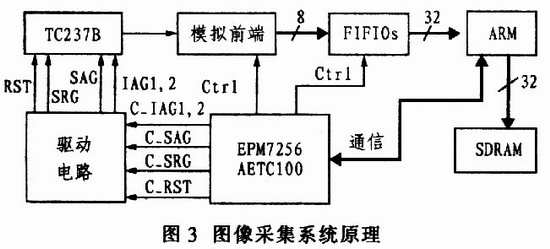 在本系統(tǒng)中,CPID是采集系統(tǒng)的控制核心,也是TC237B的信號時鐘發(fā)生器。采集時,TC237B在CPLD提供的驅(qū)動時鐘作用下完成光電轉(zhuǎn)換,并把圖像信號串行發(fā)送到模擬前端。圖像信號經(jīng)過模擬前端的信號調(diào)整和A/D轉(zhuǎn)換后,轉(zhuǎn)化為8-bit的數(shù)字量。然后在CPLD的調(diào)配下,經(jīng)過FIFO組的緩沖,由ARM處理器把數(shù)字量存放到SDRAM中,從而實現(xiàn)圖像的采集。