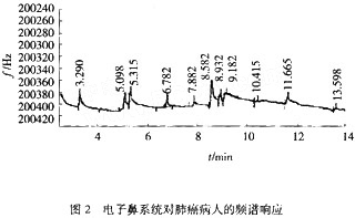 圖2為一個SAW傳感器在檢測肺癌患者呼吸氣體時的頻譜響應。它對苯乙烯響應的靈敏度為3.24 ng/Hz。