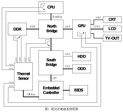 圖1為筆記本電腦的典型系統(tǒng)框圖,CPU為系統(tǒng)中最大的熱源,目前筆記本電腦普遍使用的Intel Dothan處理器其瞬間最大功耗約為37W,AMD Athlon處理器其瞬間最大功耗約為35W至40W,Intel下一代Merom處理器的瞬間最大功耗將高達(dá)50W。CPU是計(jì)算機(jī)中溫度檢測(cè)的重要目標(biāo)。目前,無(wú)論是Intel或AMD的CPU,CPU內(nèi)部都含有提供遠(yuǎn)程溫度檢測(cè)用的二極管,以提供溫度傳感器,直接檢測(cè)CPU內(nèi)部管芯的溫度,并對(duì)其進(jìn)行精確的溫度控制。