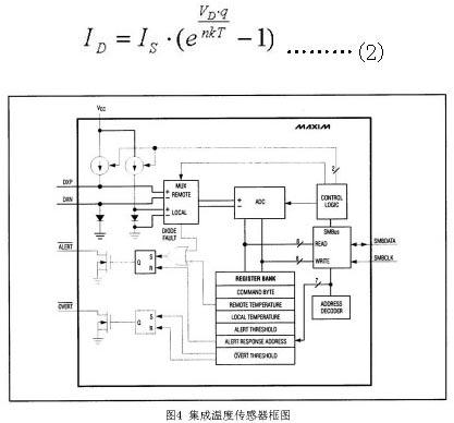 集成溫度傳感器是目前筆記本電腦普遍采用的溫度傳感器,具有精確度高、響應(yīng)速度快、體積小、功耗低、軟件界面控制方便等優(yōu)點(diǎn)。圖4為典型集成溫度傳感器框圖。溫度檢測(cè)的主要機(jī)制為集成溫度傳感器內(nèi)部的電流