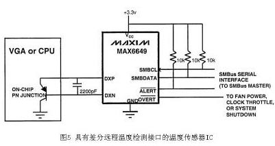 應(yīng)用中需要檢測(cè)溫度的組件較多時(shí),例如:測(cè)量CPU、GPU、芯片組和DDR的溫度時(shí),可以選用MAX1989多路遠(yuǎn)程溫度檢測(cè)器。還可以根據(jù)需要選擇舉有風(fēng)扇轉(zhuǎn)速控制功能的溫度檢測(cè)及控制IC,如MAX6635,利用風(fēng)扇轉(zhuǎn)速反饋信號(hào),使溫度傳感器IC對(duì)風(fēng)扇轉(zhuǎn)速構(gòu)成閉環(huán)回路控制。此外,在高溫保護(hù)臨界點(diǎn)的設(shè)定上,不需要軟件設(shè)定,而是通過(guò)硬件設(shè)定,以增加高溫保護(hù)的可靠性。