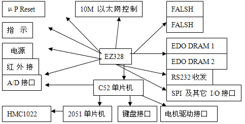 本文的課題背景是一個機器人玩具的控制系統(tǒng)設(shè)計,主芯片采用的是以摩特羅拉公司的MC86EZ328芯片,只完成與通信、運算等有關(guān)的主要操作,在沒有操作時,由運行于其上的操作系統(tǒng)uClinux來維護。對于所有與EZ328的核心運算、控制、通信、操作無關(guān)的外圍設(shè)備的維護和控制都通過一塊AT89C52來完成,它與EZ328的底層通信協(xié)議為同步串口協(xié)議(SPI),在AT89C52中由軟件來實現(xiàn)。C52包含的部件主要是A/D轉(zhuǎn)換器,鍵盤接口,電機驅(qū)動模塊。硬件結(jié)構(gòu)電路圖如下圖1: