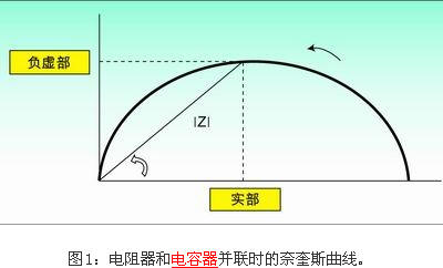 常用的方法是將產(chǎn)生的阻抗與頻率的關(guān)系曲線作為數(shù)據(jù)分析的一部分。當(dāng)頻率在給定的范圍內(nèi)掃頻時(shí),奈奎斯特(Nyquist)圖是在復(fù)數(shù)平面內(nèi)以傳遞函數(shù)的實(shí)部和虛部為參數(shù)的曲線。如果圖中的x軸表示實(shí)部,y軸表示虛部(注意:y軸取負(fù)數(shù)),就可以得到每個(gè)頻率點(diǎn)的阻抗表示。換句話說(shuō)就是,曲線上的每個(gè)點(diǎn)都代表了某個(gè)頻率點(diǎn)的阻抗?梢詮南蛄块L(zhǎng)度|Z|和該向量與x軸之間的夾角?計(jì)算出阻抗。圖1為電阻器和電容器并聯(lián)時(shí)的典型奈奎斯曲線。