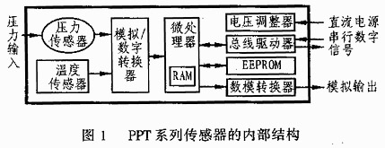 霍尼威爾分司的精密智能壓力傳感器有PPT型和PPT-R型兩種系列,其中PPT適用于干性氣體,而PPT-R則帶有不繡鋼隔膜,適用于對(duì)腐蝕性介質(zhì)的測(cè)量。PPT系列傳感器綜合了模式擬傳感器的技術(shù)特點(diǎn),可由用戶自己決定是否使用和怎樣使用智能功能。每個(gè)PPT傳感器均可在全溫區(qū)和全壓略范圍內(nèi)對(duì)其數(shù)字輸出和模擬輸出進(jìn)行精確定標(biāo)。因此,它是一個(gè)既非常精確又標(biāo)準(zhǔn)的模擬電壓輸出裝置,也是一個(gè)完善的、具有地址的數(shù)字傳感器,并可在RS232總線上許多傳感器一起聯(lián)網(wǎng)使用。PPT傳感器可以幫助用戶向數(shù)字測(cè)量系統(tǒng)過(guò)渡,而不用增加新的昂貴的硬件設(shè)備。該系列傳感器的內(nèi)部結(jié)構(gòu)如圖1所示。