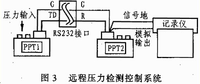 如果要使用一個(gè)繪圖儀或其它模擬輸出設(shè)備來(lái)記錄和監(jiān)視遠(yuǎn)端的壓力測(cè)量數(shù)據(jù),那么,一個(gè)有效的方法就是通過(guò)RS232總線讓PPT1壓力傳感器傳輸一個(gè)數(shù)字壓力信號(hào)到繪圖儀,然后在靠近繪圖儀的傳感器PPT2上把這個(gè)信號(hào)還原成模擬信號(hào),圖3所示是一個(gè)遠(yuǎn)程壓力檢測(cè)控制系統(tǒng)的連接圖。由于RS232總線具有很好的抗噪聲能力和很低的連接損耗,因此,用戶可以把兩個(gè)PPT傳感器之間的距離擴(kuò)展到幾公里。