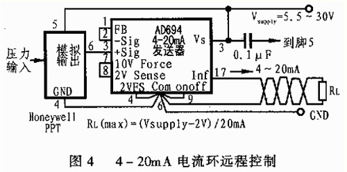 圖4所示是選用一個(gè)AD694(4-20mA電流轉(zhuǎn)換器)和一個(gè)電容器來(lái)完成這項(xiàng)工作的電路圖。