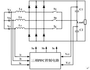 在這種架構(gòu)中最主要的進(jìn)行功率變換的是功率因數(shù)校正電路及DC-DC變換電路。其中三相功率因數(shù)校正的拓?fù)渑c控制方式很多。其按輸入電感電流的狀態(tài)可分為兩種:一種是電流連續(xù)模式(CCM)[1][2],另一種是電流斷續(xù)模式(DCM)[3][4][5]。DCM模式電流峰值高,輸入電流畸變較大,不太適用于性能要求高的場(chǎng)合。