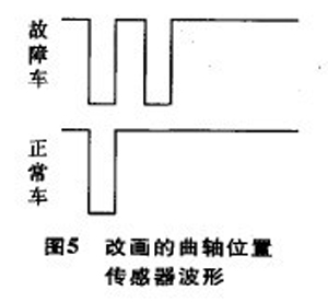 故障總結(jié) 為什么此車會出現(xiàn)間歇性起動困難的現(xiàn)象?再來看一下圖1與圖2中曲軸位置傳感器的波形,假如在圖1中曲軸位置傳感器波形最上方向下一點的位置畫一橫線,又在圖2中曲軸位置傳感器波形上同樣位置畫一橫線,根據(jù)在此線上有無波形可得出圖5中的2個波形,ECU只有得到圖5下圖波形才能發(fā)出點火信號起動發(fā)動機(jī),而ECU得到圖5上的波形不能發(fā)出點火信號起動發(fā)動機(jī),但在偶然的時刻故障位置產(chǎn)生的波形恰好達(dá)到合格的底線時,就可以起動發(fā)動機(jī)。起動后,ECU對曲軸位置傳感器波形的檢測就不是那么嚴(yán)了,因此,發(fā)動機(jī)起動后不會熄火。也就是此車故障的根本原因。