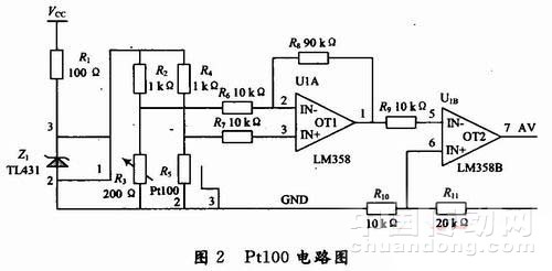 檢測水溫現(xiàn)多采用PT1OO傳感器,電路圖如圖2所示。
