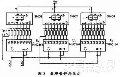 該系統(tǒng)采用靜態(tài)顯示的方式,用3個數(shù)碼管交替顯示水溫、時間、報警的信息,在按鍵時,也將用數(shù)碼管顯示。水位級別顯示則用LED顯示。顯示電路由3個移位寄存器74HC164和3個數(shù)碼組成。每個數(shù)碼管接有8個1 kΩ電阻,保護(hù)數(shù)碼管,防止電流過大燒壞數(shù)碼管。具體的電路如圖3所示。
