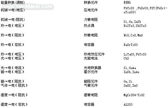 現(xiàn)代傳感器制造業(yè)的進(jìn)展取決于用于傳感器技術(shù)的新材料和敏感元件的開(kāi)發(fā)強(qiáng)度。傳感器開(kāi)發(fā)的基本趨勢(shì)是和半導(dǎo)體以及介質(zhì)材料的應(yīng)用密切關(guān)聯(lián)的。表1.2中給出了一些可用于傳感器技術(shù)的、能夠轉(zhuǎn)換能量形式的材料。