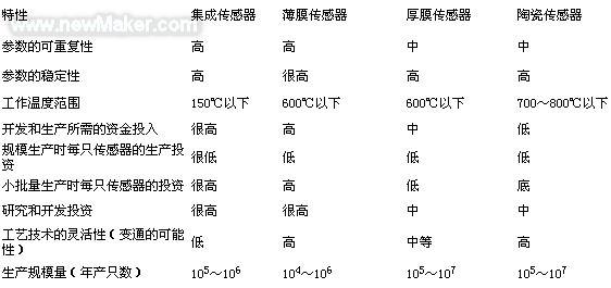 從列于表1.3中的比較中可知,每種工藝技術(shù)都有自已的優(yōu)點(diǎn)和不足。由于研究、開(kāi)發(fā)和生產(chǎn)所需的資本投入較低,以及傳感器參數(shù)的高穩(wěn)定性等原因,采用陶瓷和厚膜傳感器比較合理。