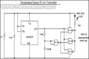 圖1 IR發(fā)射器,用溫度—周期轉(zhuǎn)換器(MAX6576)為每個正向轉(zhuǎn)換產(chǎn)生一個短的10 s IR脈沖