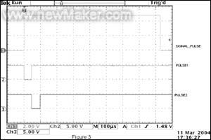 一個史密特觸發(fā)器單元和2個級連數(shù)字差分器執(zhí)行信號恢復和定時。圖3的示波器波形示出~1ms恢復脈沖(SIGNAL-PULSE,也是數(shù)字輸出)和由SIGNAL-PULSE觸發(fā)的兩個時序50 s脈沖(PULSE 1和PULSE 2)。