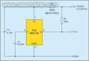 圖3所示為采用TLE 4921-3U的測(cè)量電路。濾波電容CF(470nF)直接連到管腳4,另外在供電線路上加一個(gè)旁路電容(CS=4.7nF),并采用一個(gè)300Ω的串聯(lián)電阻(測(cè)試脈沖5采用400Ω電阻)。某些應(yīng)用不允許這樣高的串聯(lián)電阻,因?yàn)闀?huì)引起供電電壓下降。如果采用50到150Ω的較小串聯(lián)電阻,那么幾乎不會(huì)對(duì)下面的結(jié)果產(chǎn)生影響,僅對(duì)脈沖5會(huì)有些影響。由于其長(zhǎng)達(dá)400ms的持續(xù)時(shí)間,這種所謂的負(fù)載突降(load-dump)脈沖會(huì)使TLE 4921-3U器件產(chǎn)生很高的功耗。如果沒(méi)有一個(gè)足夠大的串聯(lián)電阻,該器件也許會(huì)損壞。因此,最小的電阻必須適應(yīng)有關(guān)應(yīng)用的負(fù)載突降需求,反之亦然。另一種可供選擇的方法是在供電線路上加一個(gè)抑制二極管,這樣就不必采用大串聯(lián)電阻。