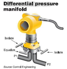 圖5:差壓變送器經(jīng)常使用歧管來(lái)減少連接件。這歧管包括閥門(mén)來(lái)隔離任一邊或如果需要的話(huà)均衡內(nèi)部壓力。
