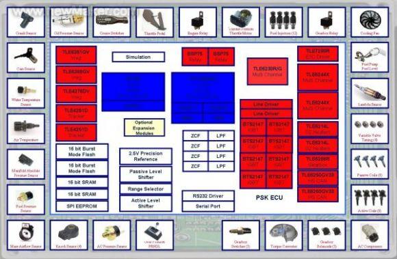 通過這一綜合的電控單元,可以十分輕松的調試系統(tǒng),為32位的高速的發(fā)動機管理系統(tǒng)以及變速箱管理體統(tǒng)的開發(fā)提供了有力的支持。這個系統(tǒng)的主要器件都是基于英飛凌的產品,體現(xiàn)了英飛凌完整的汽車電子產品線。