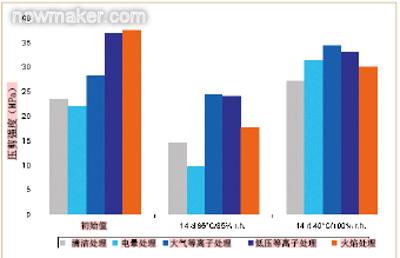 圖3 不同表面處理方法對(duì)使用環(huán)氧樹脂粘接PBT后立即測(cè)量和濕度儲(chǔ)存后測(cè)量的粘著力影響