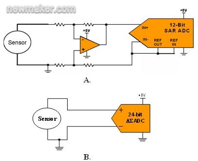 一個24位Δ-Σ(B)顯示了一個直接連接至轉(zhuǎn)換器的傳感器
