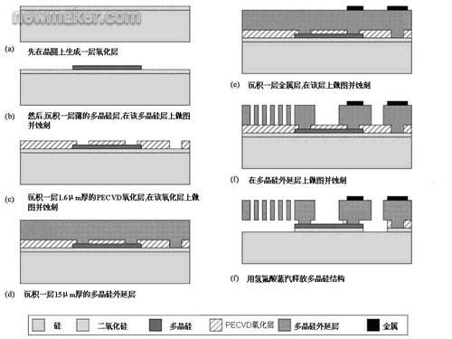 這個(gè)制程的第一個(gè)步驟是在晶圓上生成一層2.5μm厚的熱二氧化硅(圖2a)。第二步是用LPCVD沉積一個(gè)多晶硅層(多晶硅層1)。在這個(gè)多晶硅層上做版圖然后蝕刻,制成埋入式電連接結(jié)構(gòu),用于傳感器向外部傳遞電位和電容信號(hào)(圖2b)。根據(jù)器件的設(shè)計(jì),這個(gè)多晶硅層還可用于制造薄多晶硅微加工器件的結(jié)構(gòu)層。然后,用PECVD沉積一層1.6μm厚的二氧化硅層。這個(gè)PEVCD氧化層與2.5μm厚的熱二氧化硅構(gòu)成一個(gè)4.1μm厚的復(fù)合氧化層,用作THELMA制程中的犧牲層。然后,在PECVD沉積氧化物層上做版圖和蝕刻,用作厚多晶硅器件的錨定區(qū),稍后制成錨定組件(圖 2c)。下一步,用外延沉積法沉積一層厚多晶硅 (圖2d)。這個(gè)層的厚度可以根據(jù)器件設(shè)計(jì)做相應(yīng)的調(diào)整,厚度范圍是15μm到50μm。通過(guò)沉積、版圖和蝕刻工藝,制作一個(gè)連接傳感器的金屬導(dǎo)電層(圖2e)。隨后,用深反應(yīng)離子蝕刻方法(DRIE)在厚多晶硅層上做圖和蝕刻,一直到底部的氧化層(圖2f)。DRIE方法準(zhǔn)許在厚多晶硅層上制作縱橫比很大的結(jié)構(gòu)。最后用氫氟酸蒸汽去除犧牲層,釋放多晶硅結(jié)構(gòu)層(圖2f)。