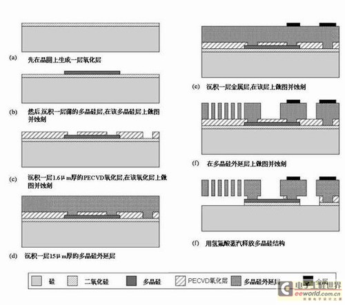 這個(gè)制程的第一個(gè)步驟是在晶圓上生成一層2.5μm厚的熱二氧化硅(圖2a)。第二步是用LPCVD沉積一個(gè)多晶硅層(多晶硅層1)。在這個(gè)多晶硅層上做版圖然后蝕刻,制成埋入式電連接結(jié)構(gòu),用于傳感器向外部傳遞電位和電容信號(hào)(圖2b)。根據(jù)器件的設(shè)計(jì),這個(gè)多晶硅層還可用于制造薄多晶硅微加工器件的結(jié)構(gòu)層。然后,用PECVD沉積一層1.6μm厚的二氧化硅層。這個(gè)PEVCD氧化層與2.5μm厚的熱二氧化硅構(gòu)成一個(gè)4.1μm厚的復(fù)合氧化層,用作THELMA制程中的犧牲層。然后,在PECVD沉積氧化物層上做版圖和蝕刻,用作厚多晶硅器件的錨定區(qū),稍后制成錨定組件(圖 2c)。下一步,用外延沉積法沉積一層厚多晶硅 (圖2d)。這個(gè)層的厚度可以根據(jù)器件設(shè)計(jì)做相應(yīng)的調(diào)整,厚度范圍是15μm到50μm。通過沉積、版圖和蝕刻工藝,制作一個(gè)連接傳感器的金屬導(dǎo)電層(圖2e)。隨后,用深反應(yīng)離子蝕刻方法(DRIE)在厚多晶硅層上做圖和蝕刻,一直到底部的氧化層(圖2f)。DRIE方法準(zhǔn)許在厚多晶硅層上制作縱橫比很大的結(jié)構(gòu)。最后用氫氟酸蒸汽去除犧牲層,釋放多晶硅結(jié)構(gòu)層(圖2f)。