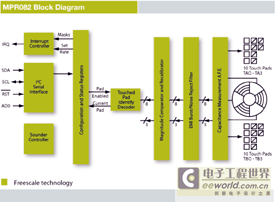 圖2 MPR082接近傳感器是一款能處理20個(gè)觸摸片的用戶接口控制器