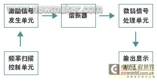 其工作過程為頻率掃描控制單元發(fā)出控制指令給激勵信號發(fā)生單元,使之產(chǎn)生某一頻率的正弦激勵信號,諧振器在該激勵信號下受迫振動,待其達(dá)到穩(wěn)態(tài)響應(yīng)后,由微弱信號處理單元對該微弱振動輸出信號進(jìn)行檢測和處理,然后送由輸出顯示單元繪制頻率響應(yīng)曲線,并計(jì)算相關(guān)參數(shù),如Q值、諧振頻率、諧振相位等。