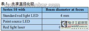 連接在點(diǎn)光源LED側(cè)面的焊線以及精密的光學(xué)元件,還可以從紅光傳感器中產(chǎn)生幾乎等同于激光的光束(焦點(diǎn)處的光束直徑:2毫米)。因此,這些紅光傳感器在精度上比采用從側(cè)面接近的常規(guī)LED傳感器有顯著的提高。如果需要可靠地檢測比較大型的物體,則標(biāo)準(zhǔn)的紅光LED仍然是首選。