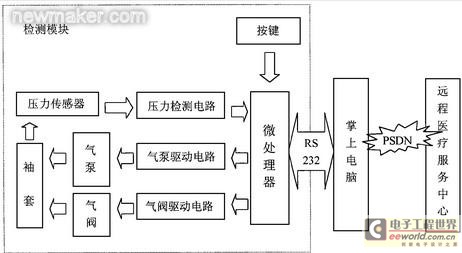 血壓測(cè)量方法目前主要有柯氏音法和振動(dòng)法(oscillometric method) 兩種。由于振動(dòng)法較柯氏音法具有抗干擾能力強(qiáng), 測(cè)量可靠, 便于實(shí)現(xiàn)血壓自動(dòng)檢測(cè)的優(yōu)點(diǎn), 本研究選擇采用了振動(dòng)法[3 ] 。為了增加儀器的遠(yuǎn)程傳輸和存儲(chǔ)能力, 本研究進(jìn)一步引入了掌上電腦。整個(gè)血壓Holter 由血壓檢測(cè)模塊和掌上電腦兩部分組成。其中, 檢測(cè)模塊是一內(nèi)置微處理器的智能模塊, 負(fù)責(zé)氣泵的充放氣控制和袖套內(nèi)壓力信號(hào)的檢測(cè)、放大與采集; 掌上電腦負(fù)責(zé)充放氣閾值與測(cè)量間隔等測(cè)量參數(shù)的設(shè)置, 血壓波形數(shù)據(jù)分析、存儲(chǔ)以及記錄波形、數(shù)據(jù)的回放和遠(yuǎn)程傳輸。我們選用的是聯(lián)想天璣2000 掌上電腦, 它的主要配置為32 位RISC、主頻為75MHz 的Philips PR31700 處理器, 8M 隨機(jī)存儲(chǔ)器(RAM) , 16M 只讀存儲(chǔ)器(ROM) 和240 ×320 帶EL 背景光和壓感輸入的液晶屏幕。其它配置包括內(nèi)置麥克風(fēng)、揚(yáng)聲器及33.6Kbps 軟Modem , RS232 擴(kuò)展口以及手寫(xiě)輸入筆等。此外, 整機(jī)不含電池重量?jī)H為230 克。上述配置能很好地滿足血壓參數(shù)遠(yuǎn)程監(jiān)測(cè)的要求。圖1 為整個(gè)血壓Holter 的功能框圖, 檢測(cè)模塊與掌上電腦之間通過(guò)RS232 接口實(shí)現(xiàn)通信, 而掌上電腦利用其內(nèi)置調(diào)制解調(diào)器, 通過(guò)電話線與中心站服務(wù)器建立遠(yuǎn)程通信。