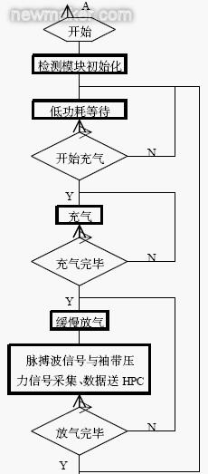 掌上電腦進(jìn)入測(cè)量程序后, 設(shè)置充放氣閾值和測(cè)量間隔時(shí)鐘, 定時(shí)通過(guò)串口向微處理器發(fā)出測(cè)量指令, 喚醒微處理器使其從低功耗等待狀態(tài)進(jìn)入正常工作狀態(tài)。微處理器首先通過(guò)IPO 口啟動(dòng)氣泵、關(guān)閉氣閥給袖帶充氣, 期間通過(guò)定時(shí)器Timer A 中斷啟動(dòng)APD 轉(zhuǎn)換器通道1 監(jiān)測(cè)袖帶內(nèi)壓力變化; 待袖套內(nèi)壓力達(dá)到預(yù)設(shè)充氣閾值后, 微處理器關(guān)閉氣泵, 袖帶由于氣路中設(shè)計(jì)的“針孔”而緩慢放氣,期間微處理器又通過(guò)定時(shí)器Timer A 和Timer B 中斷分別啟動(dòng)APD 轉(zhuǎn)換器通道1 和通道2 記錄袖帶內(nèi)壓力信號(hào)和脈搏波信號(hào), 并將脈搏波數(shù)據(jù)存入微處理器的Flash memory 中; 待袖套內(nèi)壓力降到放氣預(yù)設(shè)值后, 微處理器打開(kāi)氣閥, 快速釋放袖帶內(nèi)的氣體, 將Flash Memory 記錄的脈搏波數(shù)據(jù)傳送給掌上電腦, 最后將工作時(shí)鐘切換到低頻晶振, 重新進(jìn)入低功耗等待模式。