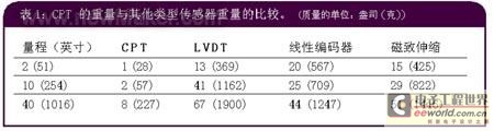 重量輕—CPT是用質(zhì)量輕不銹鋼或高強度大拉力結(jié)構(gòu)的線纜測量位移的。該特征連同通常采用的陽極化鋁組件,導(dǎo)致產(chǎn)品的質(zhì)量-量程比很低。輕量的特征也能提高產(chǎn)品用于工業(yè)機械設(shè)備應(yīng)用在振動大的環(huán)境下的使用壽命。下列對比表介紹的是各種位移測量傳感器的重量與范圍的比較。