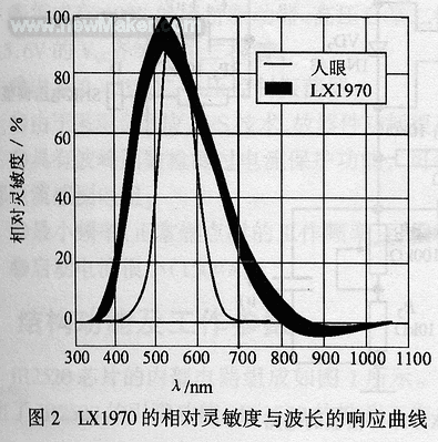 。蹋兀保梗罚暗南鄬(duì)靈敏度與波長(zhǎng)的響應(yīng)曲線如圖2中的粗線所示,細(xì)線是人眼的響應(yīng)曲線(峰值波長(zhǎng)為550nm)。由圖可見(jiàn),LX1970接收光的波段與人眼非常相近,并且也象人眼一樣靈敏。其峰值波長(zhǎng)λP為520nm,波段大約為350nm~800nm,能覆蓋整個(gè)可見(jiàn)光波段(400nm~700nm),而紫外光波段(<400nm和紅外光波段(>700nm)都很窄,這表明它對(duì)可見(jiàn)光的接收靈敏度最高。LX1970在峰值波長(zhǎng)為520nm時(shí)的靈敏度K為0.38μA/lx,即照度每變化1lx(勒克斯),輸出電流變化0.38μA。將照度轉(zhuǎn)換成亮度L(其單位是cd/m2)時(shí),可假定光線照射在一個(gè)能滿(mǎn)足全反射條件的理想平面上,然后根據(jù)1lx=0.314 cd/m2進(jìn)行轉(zhuǎn)換即可得到亮度值。通常,可用實(shí)驗(yàn)的方法來(lái)測(cè)定亮度與照度的比例系數(shù)。