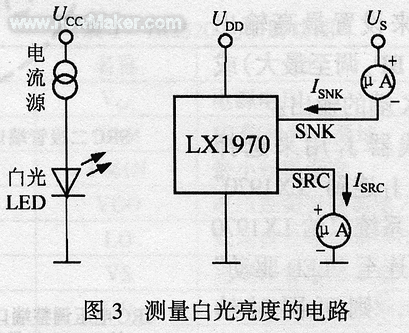 測(cè)量白光亮度的電路如圖3所示。該電路在工作時(shí)先由RCC、電流源和白光LED組成的光源發(fā)射出可見(jiàn)光,再由LX1970接收該可見(jiàn)光并轉(zhuǎn)換成電流信號(hào)。接下來(lái)在SNK端、SRC端各串聯(lián)一塊微安表以分別測(cè)量光電流ISNK和ISRC,這樣微安表的讀數(shù)值就反映了亮度的高低。