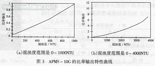 在含有fOrmAzIN(一種呈懸浮狀態(tài)并具有光學(xué)特性的化學(xué)聚合物顆粒)的標(biāo)準(zhǔn)體試樣中,實測APMS-10G的比率輸出特性曲線如圖3所示。測量應(yīng)在室溫下進(jìn)行,以作為傳感器的標(biāo)定方法。