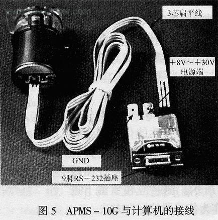 APMS-10G通過9腳rS-232插座連到計算機(jī),接線方式如圖5所示。I/O端應(yīng)接一只下拉電阻,以使總線上無信號時為0V。傳感器的輸出阻抗為440Ω~540Ω。rS-232接口是用+5V代表邏輯1,用0V代表邏輯0的邏輯信號。