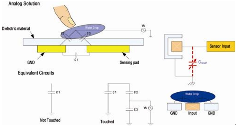 圖2: 模擬觸摸方案;由于需使用參考地,可能會(huì)受到水滴的影響。