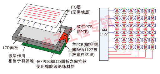 圖5:使用FMA1127實(shí)現(xiàn)的觸摸屏及PCB和觸摸屏的疊層安排。利用TDC比較由檢測電容形成RC延時(shí)線與基準(zhǔn)RC延時(shí)線的延時(shí)差別。使用差動(dòng)信號(hào)消除或降低了相關(guān)/相干噪聲源的影響,無需地層。