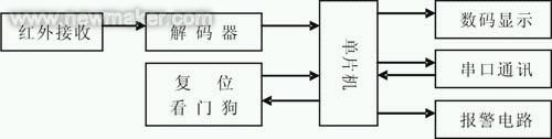 接收端的主要功能是接收紅外信號并對其進行解碼以及后續(xù)處理。監(jiān)控接收系統(tǒng)主要由AT89C51單片機、HS0038A2紅外接收頭、MC145027解碼器、MC14511數(shù)碼驅(qū)動器、MAX232串口通訊芯片等構(gòu)成,系統(tǒng)結(jié)構(gòu)圖如圖2所示。