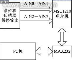 圖3為實驗系統(tǒng)的電路結構示意。實驗系統(tǒng)主要由傳感器本體(輸出原始的模擬信號)、MSC1210核心、串口通信電路和PC機組成。如前所述,微位移傳感器一組橋路輸出分別接MSC1210 ADC的AIN0與AIN1,作為一路差分輸入;另一組橋路輸出分別接MSC1210 ADC的AIN2與AIN3,作為第二路差分輸入。MSC1210通過RS232與PC機通信,實現(xiàn)信息的顯示和對MSC1210的控制。