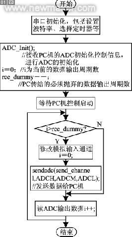 對MSC1210 ADC的各個控制字的設置將會極大地影響傳感器的最終分辨率和穩(wěn)定性。例如,輸入緩沖器使用與否、可編程放大器增益的選擇、調(diào)制器時鐘速度選擇(決定模擬采樣率以及濾波器型號的選擇)等,這些參數(shù)的設定都不是一次完成的,有些要經(jīng)過反復的組合、嘗試,最終得到滿意的結果。為了避免每次修改程序后必須重新下載到Flash程序存儲器中,MSC1210在工作之前的ADC的初始化工作由PC機完全控制。首先,PC機將各種必要的控制信息通過串口傳給MSC1210,MSC1210根據(jù)這些信息來進行ADC的初始化工作。具體地說就是,PC機向MSC1210發(fā)送6個字節(jié),這6個字節(jié)中包含了濾波器型號、ACLK、ADCON2和ADCON3寄存器中的抽樣值、修改模擬輸入信道后的延時值、必須拋棄的數(shù)據(jù)輸出周期數(shù)和可編程放大器的增益。然后,MSC1210啟動ADC的初始化工作。進入正常工作狀態(tài)后,如果發(fā)現(xiàn)當前數(shù)據(jù)輸出周期數(shù)已大于預先設置的必須拋棄的數(shù)據(jù)輸出周期數(shù),MSC1210就認為這個輸出數(shù)據(jù)及其以后的輸出數(shù)據(jù)都是有效的了,但它并不立刻將數(shù)據(jù)發(fā)送給PC機,而是要馬上修改模擬輸入通道,然后再使前一輸入通道的輸出是無效的,緊接著進入下一個數(shù)據(jù)輸出周期。MSC1210的工作流程可簡單用圖4表示。