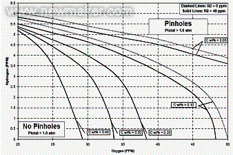 圖7 含氮0~40ppm,氧20ppm~50ppm,不同含碳量的鋼在凝固終點(diǎn)出現(xiàn)針孔的條件