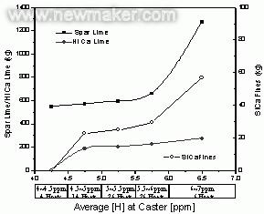 美國(guó)CitiSteel在用Hydris測(cè)定鋼中氫含量的過程中發(fā)現(xiàn),中間包鋼水在穩(wěn)態(tài)鑄造期間其中氫含量隨當(dāng)時(shí)的空氣露點(diǎn)升高而升高,最大變化量在2~3ppm[H]。添加脫氧劑、鋼包熱循環(huán)次數(shù)、連鑄的不同階段鋼中氫含量都有不同的變化[20]。
