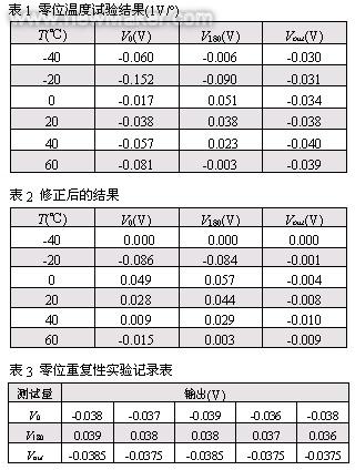 經(jīng)過對傾角傳感器自動調(diào)零原理的研究,設計并實現(xiàn)了自動調(diào)零伺服傾角傳感器樣機。為了驗證自動調(diào)零伺服傾角傳感器的自動調(diào)零和消除漂移特性,對此傾角傳感器進行高低溫試驗。其溫度試驗結果如表1所示,其中V0和V180是內(nèi)部傾角傳感器在自動調(diào)零校正操作時在兩個測量位置直接讀取的,而Vout是調(diào)零校正后的計算結果(下同)。