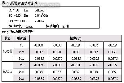 將傾角傳感器放在振動臺上進行振動試驗,振動試驗的技術條件如表4所示。記錄振動試驗前后傾角傳感器的零位輸出V0、V180和Vout。其試驗數(shù)據(jù)如表5所示。