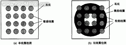 雖然電渦流線圈陣列結(jié)構(gòu)形式的設(shè)計靈活多變,但仍然可以根據(jù)其檢測方式的不同,大體歸為兩種典型的陣列類型。① 基于單線圈檢測的電渦流陣列,如圖2(a)所示,一般是直接在基底材料上制作多個敏感線圈,布置成矩陣形式的陣列,而且為了消除線圈之間的干擾,相鄰線圈之間要保留足夠的空間。這種電渦流陣列大多用于大面積金屬表面的接近式測量,檢測部件的位置、表面形貌、涂層厚度以及回轉(zhuǎn)體零件的內(nèi)外徑等,也可以用來檢測裂紋等表面缺陷。② 基于雙線圈方式的電渦流陣列檢測,一般設(shè)計為一個大的激勵線圈加眾多小的檢測線圈陣列的形式,如圖2(b),它能夠非常有效地實現(xiàn)大面積金屬表面上多個方向的缺陷的檢測,在無損檢測的應(yīng)用上具有較大的優(yōu)勢,已基本取代單線圈檢測的應(yīng)用。除此以外,近年還出現(xiàn)了一種基于電渦流效應(yīng)的環(huán)繞線圈磁力計陣列L1 ,它實際上是一種基于雙線圈檢測的陣列類型,通過對激勵線圈和檢測線圈陣列結(jié)構(gòu)的特殊設(shè)計,以取得較好的測試性能。