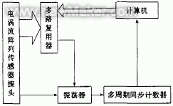 電渦流傳感器響應(yīng)速度快的特點使其能夠很好地采用電子掃描測試的方法,通過控制模擬開關(guān),逐個掃描全部的陣列單元,實現(xiàn)傳感器陣列中所有敏感單元的檢測。采用掃描采樣的方法,能夠大大簡化傳感器的后續(xù)電路,降低系統(tǒng)的成本,而且有利于傳感器系統(tǒng)的小型化,但是由于模擬開關(guān)的引入,也導致傳感器的測試精度有所下降。
