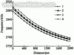 采用大面積的鐵質(zhì)平面對傳感器陣列進行標定實驗,實驗結(jié)果如圖6所示,圖6中4條曲線分別是傳感器陣列中一條支路上4個敏感單元的測試結(jié)果,4條曲線不重合的原因是由于敏感線圈位最和引線的影響,采用軟件補償?shù)姆椒茨芎芎玫亟鉀Q。測試結(jié)果表明,在2 mm 的測量范圍內(nèi),傳感器陣列的測試精度優(yōu)于±0.25。采用傳感器陣列進行測試時,由于陣列單元間寄生電容的影響,振蕩電路的中心頻率會有所降低,并導致傳感器的靈敏度略有減小。為了提高傳感器的靈敏度,對振蕩電路進行優(yōu)化設(shè)計和改進,提高振蕩電路的中心頻率,實驗結(jié)果顯示,在2 mm的量程范圍內(nèi),傳感器的平均測量靈敏度約為70 Hz/μm,達到了很好的效果。