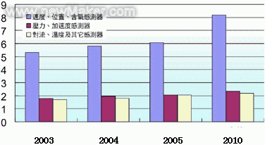 其次便是車用動(dòng)力傳感器,包括,速度與氧氣傳感器增長率為6.7%、壓力與加速度傳感器為5.7%、空氣流量、溫度與其它傳感器增長率約為4.6%,年增長率約為6.2%;在所有傳感器組件中,則以速度與氧氣傳感器產(chǎn)值最高,預(yù)估將從2005年的62億美元提升至2010年的86億美元。