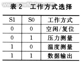 MPXY8020A有4種工作方式,其工作于哪種工作方式由S1和S0引腳的電平來決定,如表2所列。只要VDD引腳有足夠的供電電壓,不管MPXY8020A工作于何種工作方式,其內(nèi)部的多路開關(guān)、D/A寄存器、低頻振蕩器和輸出脈沖分頻器都處于激活狀態(tài)。需要注意的是,無論MPXY8020A工作于氣壓采樣方式還是溫度采樣方式,所有的EEPROM位都處于激活狀態(tài)。如果為了節(jié)能而把VDD引腳置為低電平,有必要把所有引腳的電平都置為低電平,以免MPXY8020A被誤激活。